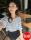 2016春夏新款韩版女小清新学生宽松百搭黑白条纹V领衬衫中袖衬衣