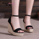 百翎夏季2017新款草编黑色坡跟凉鞋一字扣包跟草编凉鞋小码女鞋子