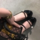 韩版春夏低跟浅口单鞋女真皮兔子毛一字扣百搭黑色中空圆头平底鞋
