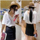 欧洲站短袖t恤女学生2017夏新款韩版白色雪纺拼接喇叭袖V领显瘦棉