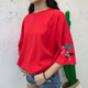七分袖女t恤学生韩版bf刺绣ulzzang短袖红色宽松大红中长款原宿风