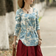 ANY灰青花瓷 上衣女夏季方领印花常规长袖复古女装衬衫衬衣棉
