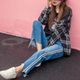 格子家2017春秋季新款女士韩版裤脚不规则直筒九分裤高腰牛仔裤子