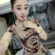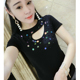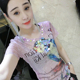 欧洲站时尚个性手工镶钻印花V领T恤女短袖修身花色亮片上衣潮女装