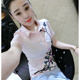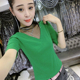 欧洲站女装时尚性感网纱拼接V领T恤女短袖夏季新款修身弹力上衣潮