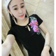 欧洲站时尚个性短袖刺绣玫瑰花朵T恤女上衣手工订珠修身半袖T恤潮