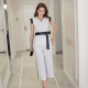 2017春夏装新款通勤 撞色潮流个性V领无袖上衣阔腿裤时尚两件套装