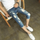 夏季七分破洞牛仔裤男士加大码破烂乞丐裤潮男日系复古修身中裤38