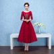 敬酒服2017新款一字肩中袖酒红色新娘结婚礼服中长款晚礼服修身