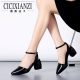 2017春夏新款漆皮一字带粗跟浅口中跟鞋镶钻圆头时尚女鞋 学生鞋