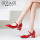 2017春夏新款 里外全皮单鞋 粗跟中跟一字扣带圆头韩版红色女鞋