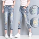 破洞牛仔裤女七分裤夏季宽松薄款哈伦裤刺绣松紧腰大码显瘦小脚裤