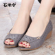 石米令夏季真皮妈妈鞋中老年鱼嘴凉鞋坡跟女鞋大码软牛皮镂空凉鞋