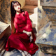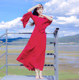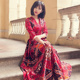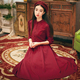 低俗小説 自制2017新款喇叭袖复古高腰修身连衣裙酒红色长裙仙