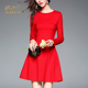 莎杜兰春装新款连衣裙名媛气质显瘦a字裙女优雅红色一字领秋冬裙