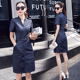 2017新款女夏短袖V领中裙A字裙高腰修身显瘦包臀牛仔连衣裙