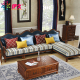 伊久 欧式实木雕花真皮组合L型沙发美式乡村复古皮布结合转角沙发