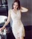 夏季新款蕾丝纽扣连衣裙 超仙长裙开叉绣花透视裙网纱中袖裙子白