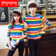Mimoishion/米茉衣尚韩版早春情侣装长袖T恤彩虹条纹打底衫男女装