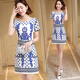 2017夏季新款中长款显瘦短袖裙子韩版修身女士青花瓷连衣裙女夏天