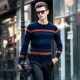 秋冬季圆领套头羊毛衫纯羊毛保暖针织衫青年男打底衫撞色休闲毛衣