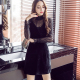 2017春装新款性感透视立领长袖蕾丝衫+丝绒修身吊带连衣裙两件套