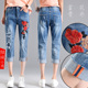 松紧腰牛仔裤女 夏季薄款宽松胖mm浅色显瘦小脚跨裤绣花 七分裤潮