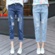 破洞牛仔裤女九分裤高腰宽松中学生小脚哈伦裤大码胖MM夏装女薄款