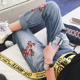 【SASA小姐】定制浅蓝色刺绣花朵小脚铅笔裤直筒长裤子 牛仔裤女