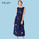 vilan/慧兰正品 2017新款夏装真丝连衣裙女无袖圆领印花褶皱裙子