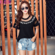 杉思情夏季棉女宽松镂空纱网短款体恤字母印花休闲蝙蝠袖短袖t恤