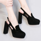 欧货欧洲站高跟单鞋浅口女鞋粗跟防水台方头扣带中空鞋真皮单鞋