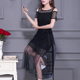 女装夏装新款2017韩版高腰裙子露肩中长款网纱短袖两件套连衣裙