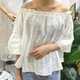 June夏季新款一字领露肩镂空雪纺衫女夏宽松白色短袖上衣蕾丝衫