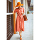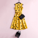法国巴黎复古英伦风 黑色圆点立体系带 姜黄色亚麻中长款连衣裙