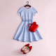 优雅赫本风 清新蓝色格子 系带围裹款伞摆中长棉布连衣裙