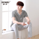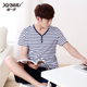 新一步夏季睡衣男士纯棉短袖长裤青年全棉套装V领条纹薄款家居服