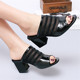 夏季黑色中跟粗跟凉拖鞋网纱中年40-50岁妈妈鞋女鞋子加大码凉鞋