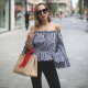 2017新款夏季海边渡假女装格子罩衫喇叭袖复古一字领露肩上衣防晒