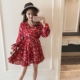 2017春款红色v领长袖小碎花雪纺连衣裙小清新印花荷叶边a字裙子