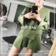 KUBERAS独家定制2017春装新款时尚设计袖V领上衣+休闲短裤绿套装