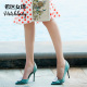 希区女郎 复古优雅女士尖头青色缎面高跟鞋女穆勒鞋ol 细跟 LDH3