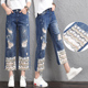 2017春季新款宽腿高腰哈伦裤九分破洞牛仔裤绣花蕾丝宽松时尚女裤