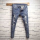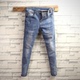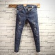 夏季时髦磨烂裤脚牛仔裤九分裤男 猫须割破修身小脚磨白9分裤男潮