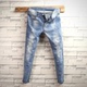 韩国潮款个性印花时尚牛仔裤男破洞设计初秋薄款牛仔修身浅色男裤