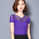 2017新款大码V领烫钻网纱打底衫女装短袖T恤女修身蕾丝上衣小衫夏