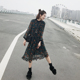 superjoy春夏装雪纺中长款长袖显瘦百褶裙墨绿色过膝小碎花连衣裙