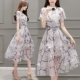 2017新款气质女装夏韩版修身高腰中长款连衣裙女欧根纱印花短袖裙