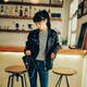 德州巴黎2017春款复古中性帅气时尚翻领黑色机车服皮衣 实数