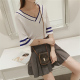 春秋短款条纹大V领喇叭袖修身针织衫上衣女半中袖荷叶边套头毛衣